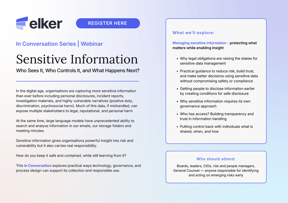 Drawing on Elker's experience in setting up speak-up systems for leading energy and construction clients across Australia, the webinar will provide real-world insights and best practices for driving cultural change.